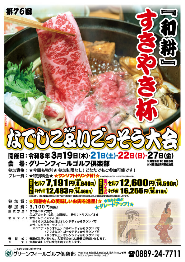 - ★昼食・1ソフトドリンク(キャディ付の方はアルコールOKドリンク)・お土産付