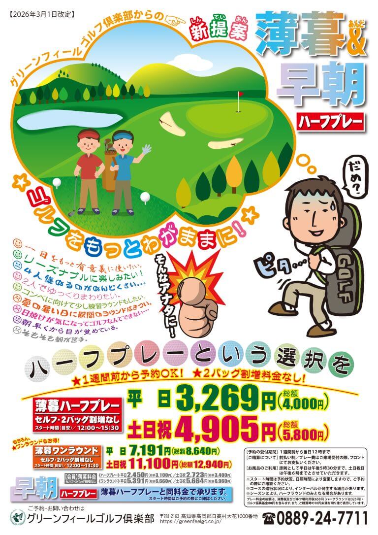 《薄暮ハーフプレー》スタート時間目安/12:00~15:30