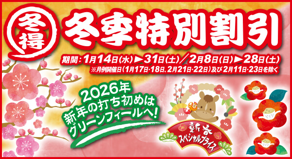 令和8年1月と2月の期間限定!冬季の特別割引料金で営業いたします。この機会にぜひご来場ください。新年の打ち初めはグリーンフィールで!