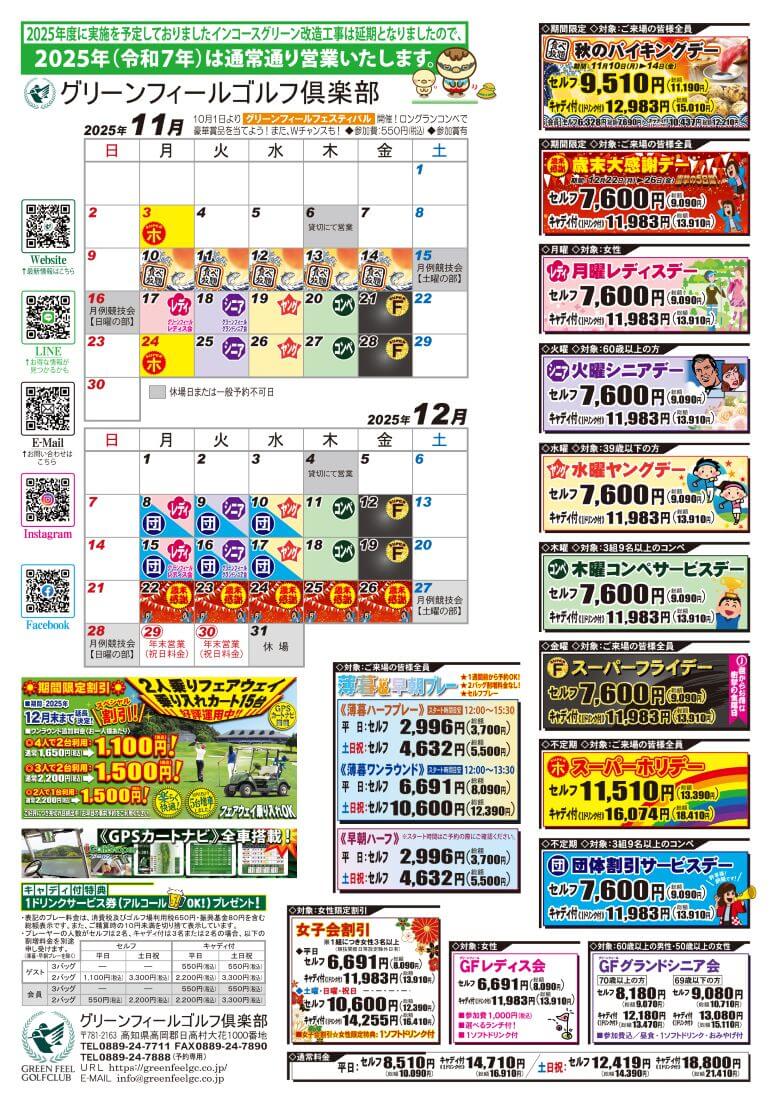 大好評!新サービスデーの12月の日程を公開しました。指定の月曜から金曜の平日が毎日お得!3組以上のコンペなら木曜に加え団体割引サービスデーも。また、休日ゴルファー必見のスーパーホリデーもお見逃しなく!