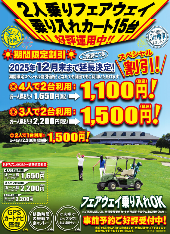 皆様に快適なゴルフプレーをお楽しみいただけますよう導入しましたフェアウェイ乗り入れカートはたいへんご好評いただいており、連日売切れが続出しています。そこで、期間限定のスペシャル割引価格を12月末まで延長することが決定いたしました!ご利用には事前予約が可能ですので、まだご利用でない方もこの機会にぜひお試しいただき、ゴルフシーズンも楽らく快適プレーをご体感ください!