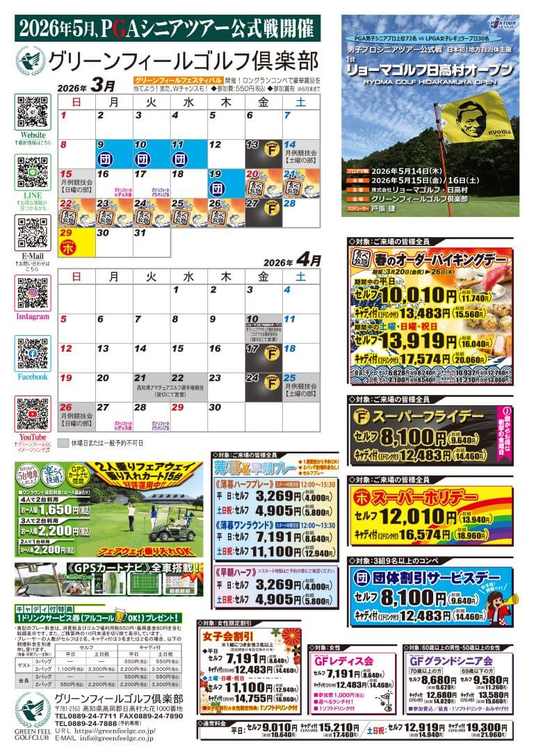 - ※表記のプレー料金はセルフは4バッグまたは3バッグ、キャディ付は4バッグの料金です。 通常料金はこちら【ご利用案内】へ
